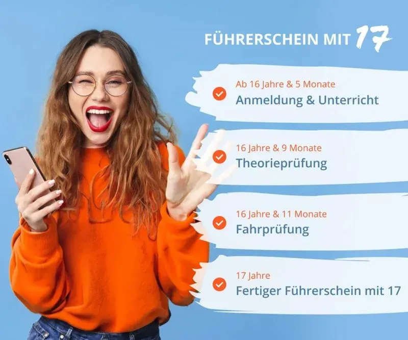 Kein Problem, du kannst mit dem Führerschein schon 6 Monate vor deinem 17. Geburtstag starten.